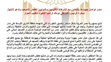 الرئيس الأمريكي دونالد ترامب الأخيرة لتغليب الحوار تتابع جمهورية مصر العربية بشكل مستمر ولصيق التطورات التي تشهدها منطقة الشرق الأوسط…