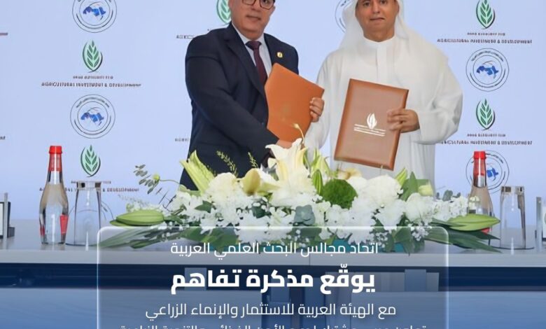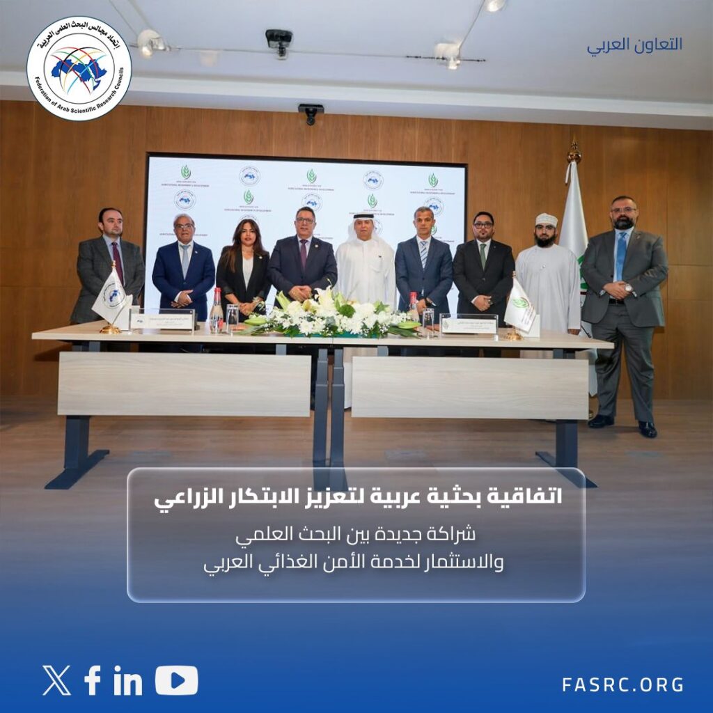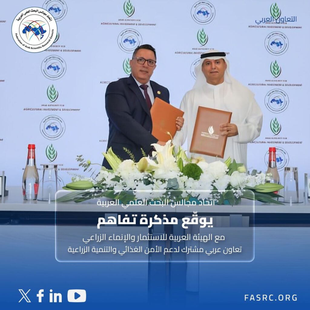 ضمن جهود الاتحاد لتعزيز التعاون في مجالات البحث العلمي والتطوير الزراعي ، ودعم الأمن الغذائي العربي والتنمية المستدامة ، وقع اتحاد مجالس البحث العلمي العربية مذكرة تفاهم مع الهيئة العربية للاستثمار والإنماء الزراعي .