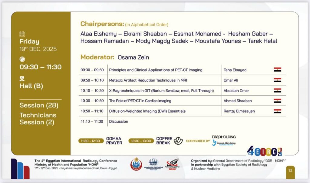 5- أحمد قابيل ، أخصائي تقنيات الأشعة بشركة عالمية عاملة في مصر في مجال التصوير الطبي والأشعة وتقنياتها ، ويعرض “التصوير بالرنين المغناطيسي للقلب.. التخطيط والبروتوكولات” .