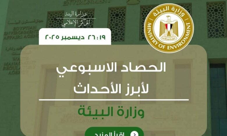 أصدر المركز الإعلامي لوزارة البيئة “الانفوجراف الأسبوعي” حول أبرز أنشطة وفعاليات الوزارة بقيادة الدكتورة منال عوض وزيرة التنمية المحلية والقائم بأعمال وزير البيئة، خلال الفترة من( ٢٠-٢٦ ديسمبر ٢٠٢٥)