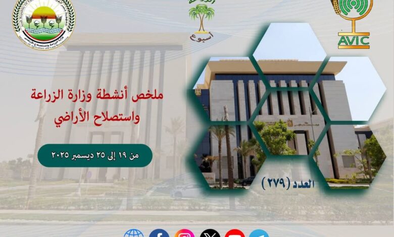 أصدر مركز المعلومات الصوتية والمرئية بوزارة الزراعة واستصلاح الأراضي، “الانفوجراف الاسبوعي” في نسخته رقم 279 حول الحصاد الاسبوعي لأهم أنشطة الوزارة، خلال الاسبوع الماضي في الفترة من 19 وحتى 25 ديسمبر الجاري، كما أصدر المركز ايضا ملخصا بالفيديو، حول انشطة الوزارة خلال نفس الفترة.