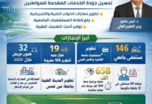 ولفت إلى تقديم 5 ملايين و16 ألفًا و355 خدمة وقائية، ومليون و993 ألفًا و534 خدمة بالرعاية الأولية (استقبال، عيادات، معامل، أسنان)، و569 ألفًا و435 خدمة صحة إنجابية، ومليون و132 ألفًا و976 خدمة عبر المبادرات الرئاسية، مع اعتماد 7 وحدات صحية من هيئة الاعتماد والرقابة، وتطوير وحدات ضمن مبادرة حياة كريمة، وافتتاح مخزن طعوم مركزي بمركز الصحة المهنية.