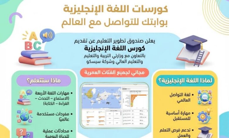أعلن صندوق تطوير التعليم التابع لرئاسة مجلس الوزراء، عن إطلاق مقررات متكاملة لدراسة اللغة الإنجليزية تستهدف الطلاب في مختلف المراحل التعليمية إلى جانب طلاب التعليم العالي والجامعي والخريجين، وذلك في إطار دعم مهارات الشباب وتأهيلهم لسوق العمل المحلي والدولي.