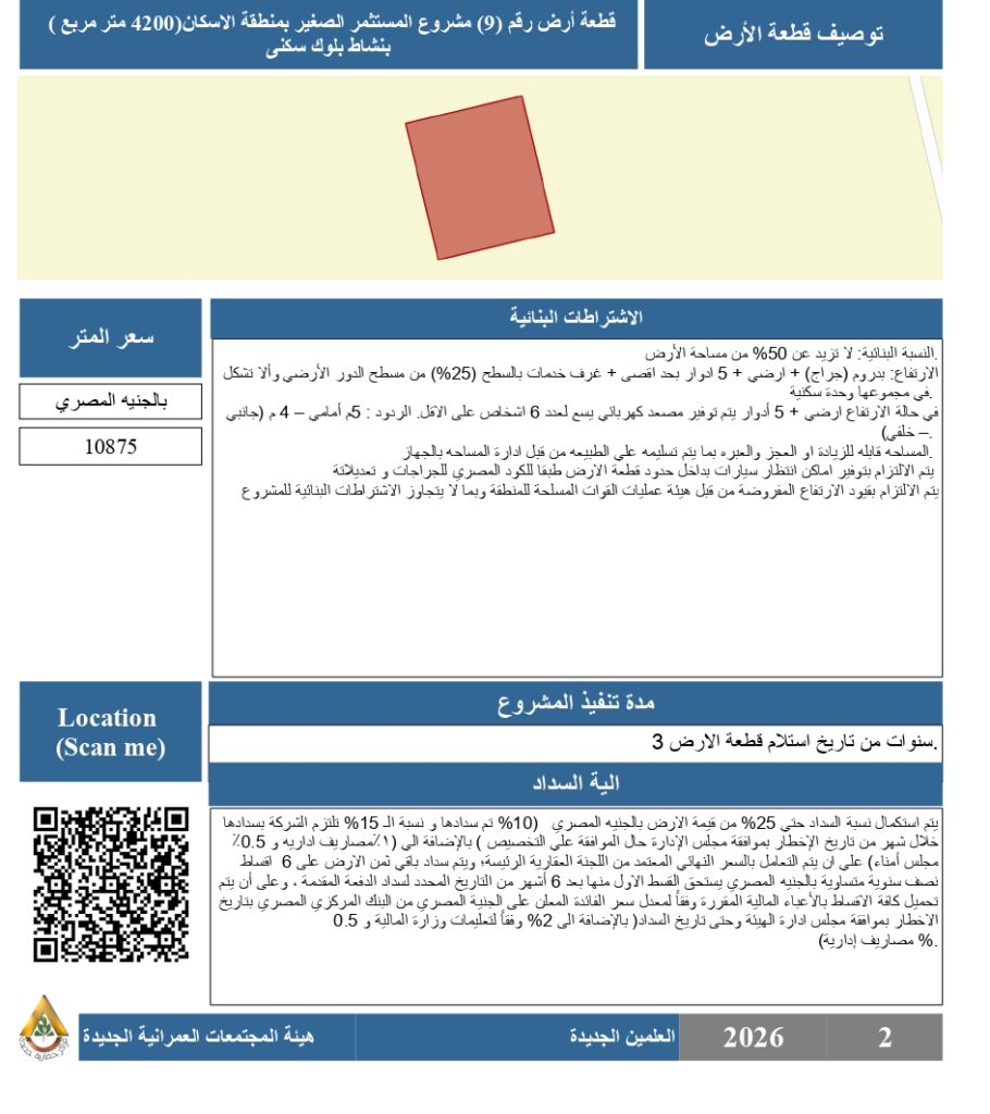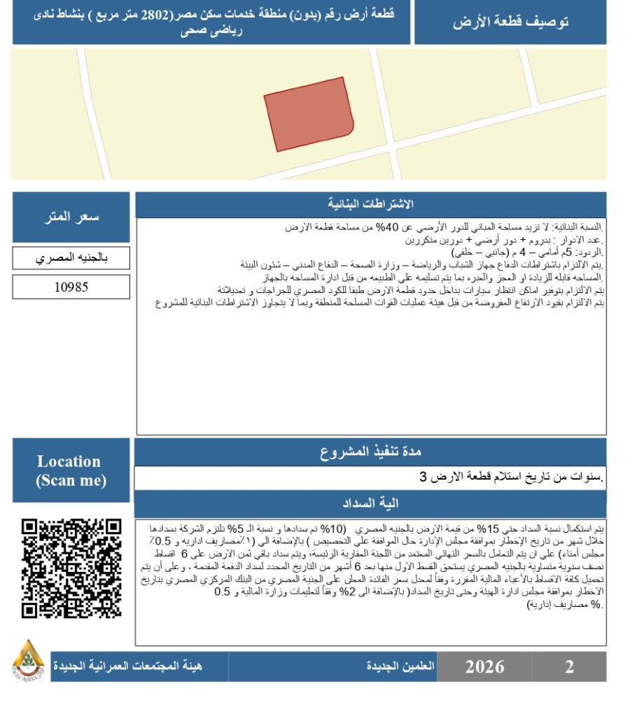 أعلن الدكتور مهندس محمد خلف الله رئيس جهاز مدينة العلمين الجديدة والمشرف على جهاز القرى السياحية، عن طرح مجموعة من أبرز الفرص الإستثمارية المميزة بنظام البيع لتلبية الإحتياجات المستقبلية للمدينة، وذلك خلال الفترة من (1) وحتى يوم (15) من شهر فبراير الجارى ، والتي تأتي في إطار خطة هيئة المجتمعات العمرانية الجديدة للتوسع في جذب الإستثمارات المتنوعة ودعم الأنشطة الخدمية والسكنية والطبية داخل المدينة.