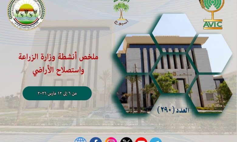 يذكر ان مركز المعلومات الصوتية والمرئية، والمكتب الاعلامي للوزارة، يصدران الجمعة من كل اسبوع، انفوجرافا وفيديو باسم: الزراعة في اسبوع، لالقاء الضوء على ملخص ما تم من انشطة وجهود، بكافة القطاعات والهيئات، التابعة للوزارة.
