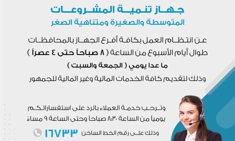 في إطار حرص الدولة على دعم قطاع المشروعات المتوسطة والصغيرة ومتناهية الصغر، وتعزيز بيئة ريادة الأعمال، أعلن جهاز تنمية المشروعات المتوسطة والصغيرة ومتناهية الصغر عن استمرار العمل بكافة أفرعه بالمحافظات طوال أيام الأسبوع، بما في ذلك يوم الأحد، وذلك من الساعة 8 صباحًا حتى 4 عصرًا (عدا يومي الجمعة والسبت).
