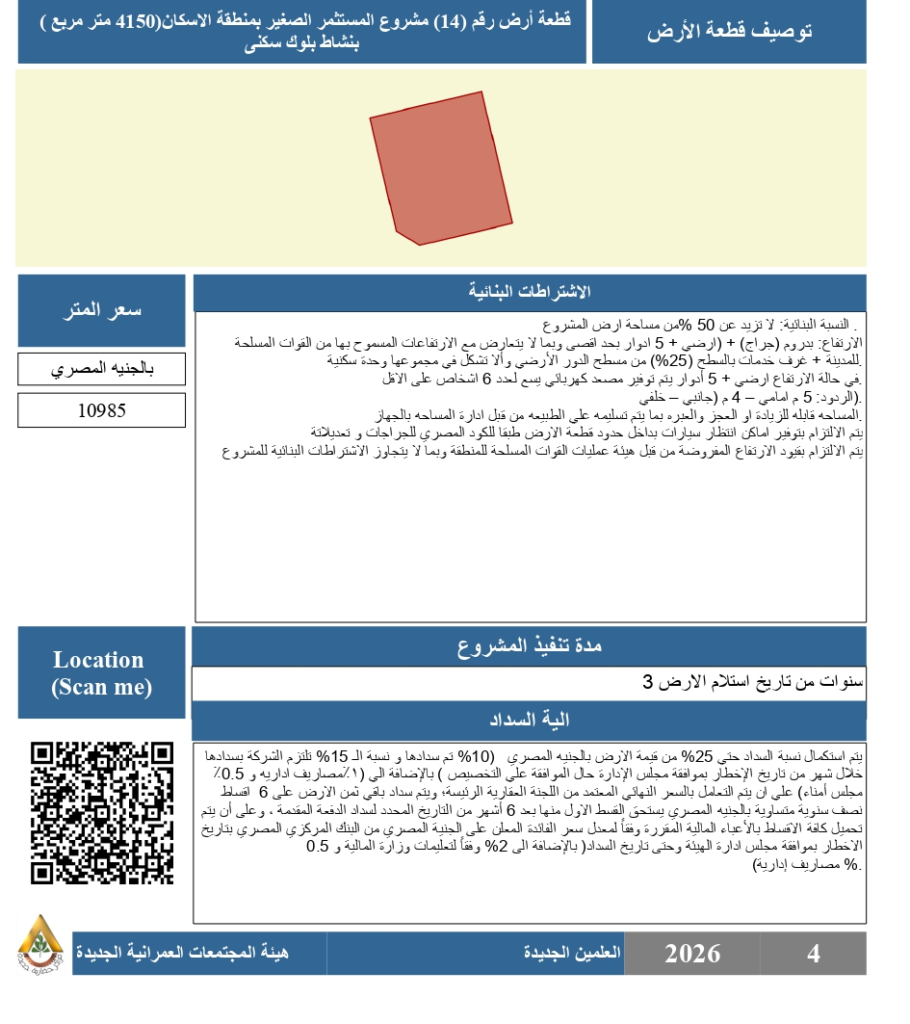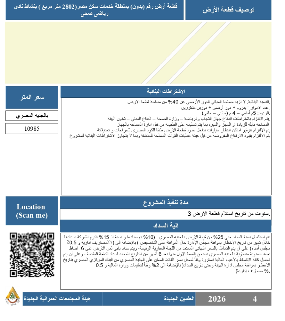 أكد الدكتور محمد خلف الله أن قطع الأراضي يتم إتاحتها بصورة دورية ليتمكن راغبو الاستثمار من الاطلاع على تفاصيل التقدم للحجز والاشتراطات البنائية وأسلوب السداد عبر بوابة خدمات المستثمرين التابعة لهيئة المجتمعات العمرانية الجديدة: