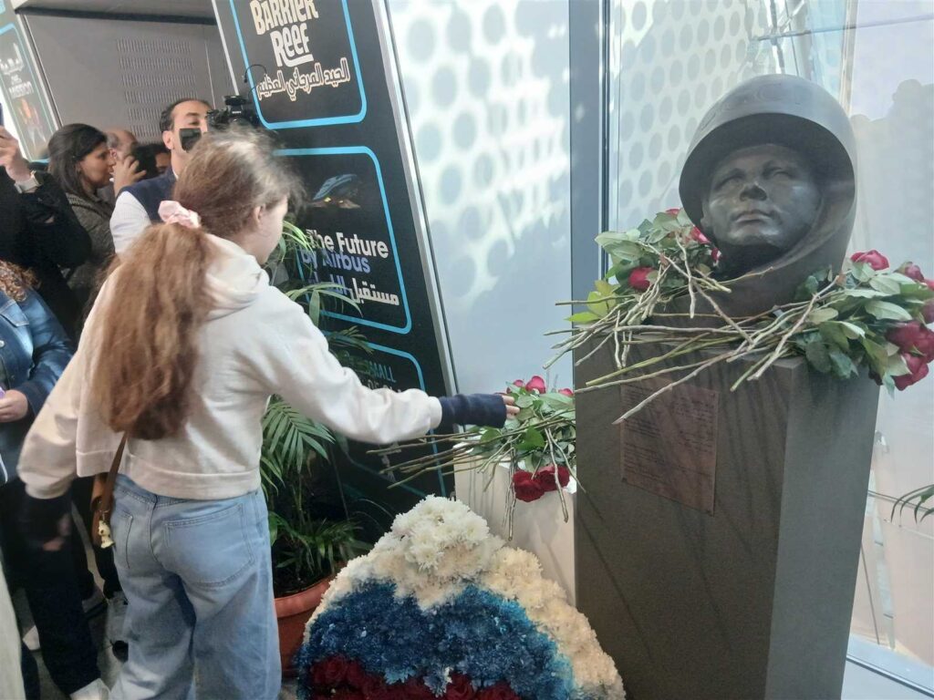 و​ وضع إكليل من الزهور على التمثال النصفي ليوري جاجارين بمركز القبة السماوية، تلاه عرض فيلم وثائقي حول علوم الفضاء والرحلات الفضائية بالقبة السماوية