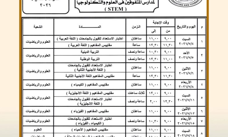 أعلنت وزارة التربية والتعليم والتعليم الفني، جدول امتحانات شهادة إتمام الثانوية العامة للدور الأول 2026 لطلاب مدارس المتفوقين في العلوم والتكنولوجيا (STEM)، للعام الدراسي 2025/2026، حيث تنطلق امتحانات الفرصة الأولى يوم 16 مايو المقبل وتستمر حتى 30 يونيو، بينما تبدأ امتحانات الفرصة الثانية يوم 4 يوليو وتنتهي في 22 يوليو.