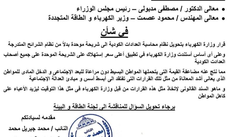 تقدم النائب محمد جبريل عضو مجلس النواب وأمين الشؤون البرلمانية لحزب مستقبل وطن بالإسكندرية بسؤال برلماني عاجل إلى الحكومة بشأن قرار وزارة الكهرباء المتعلق بتغيير نظام محاسبة العدادات الكودية.