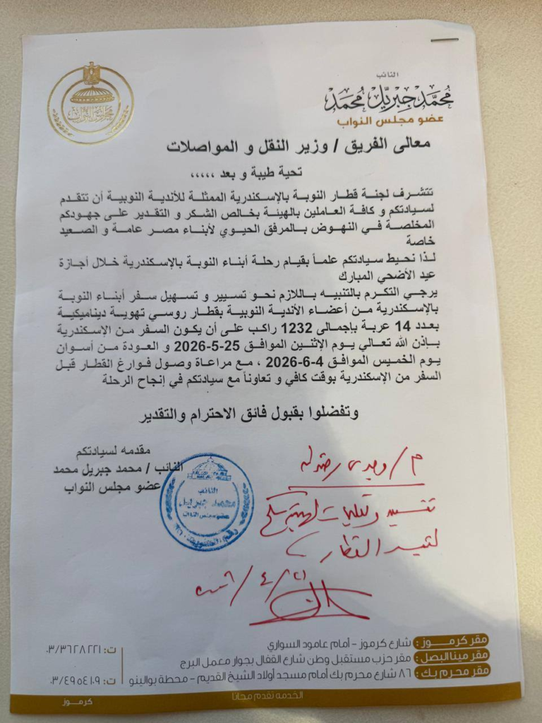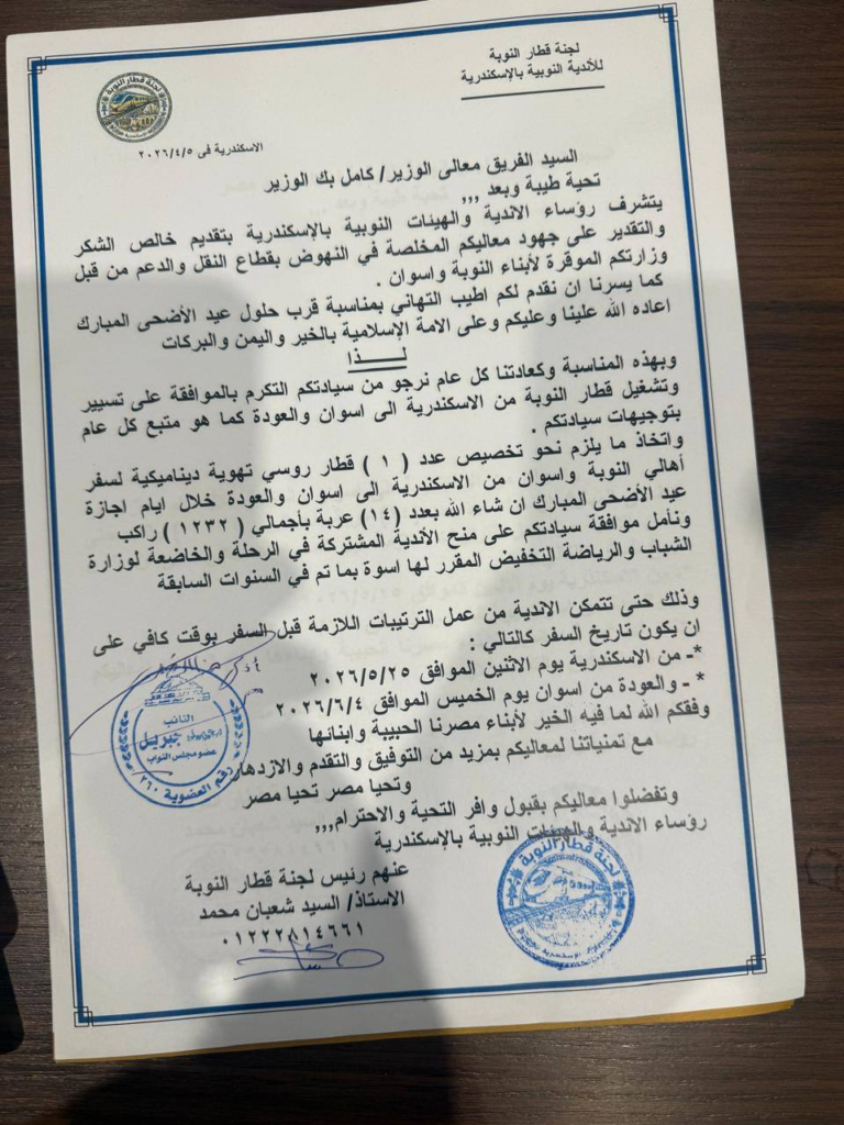 جاءت هذه الخطوة استجابةً للطلب الرسمي المقدم من لجنة “قطار النوبة” بالأندية النوبية بالإسكندرية إلى النائب والذي تضمن مناشدة وزارة النقل لتسهيل رحلة العودة إلى الديار في المناسبات السنوية. وتأتي هذه الموافقة تأكيداً على نهج الدولة في دعم أبناء النوبة والاهتمام بمتطلباتهم الحياتية والاجتماعية.